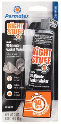 Permatex® The Right Stuff® 90 Minute Gasket Maker – BLACK. The Right Stuff® 90 Minute is the only gasket maker in a tube that can return a vehicle back to service quickly – just 90 minutes curing time! It outperforms pre-cut gaskets by providing superior adhesion to flanges with maximum flexibility. A premium professional grade gasket maker for today’s fast-paced professional garage and heavy DIY’er. Temperature range -65°F to 500°F Intermittent. Compared to Permatex® the Right Stuff® GREY Gasket Maker, our BLACK formula offers higher oil resistance and greater flexibility.